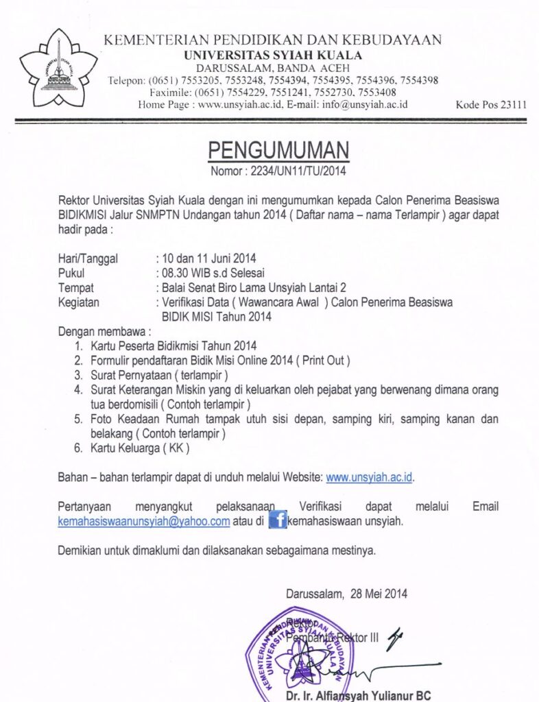 Sebagaimana tahun-tahun sebelumnya, Universitas Syiah Kuala akan melakukan verifikasi terhadap seluruh mahasiswa calon penerima beasiswa Bidikmisi yang lulus melalui jalur SNMPTN 2014. Kegiatan verifikasi akan berlangsung pada hari Selasa dan Rabu, tanggal 10 dan 11 Juni 2014. Setiap calon penerima beasiswa Bidikmisi diminta untuk membawa dokumen-dokumen pendukung. Contoh dokumen pendukung dapat diunduh di laman ini. Surat resmi dan nama-nama calon penerima beasiswa BidikMisi 2014 yang lulus melalui jalur SNMPTN dapat dilihat di bawah ini.